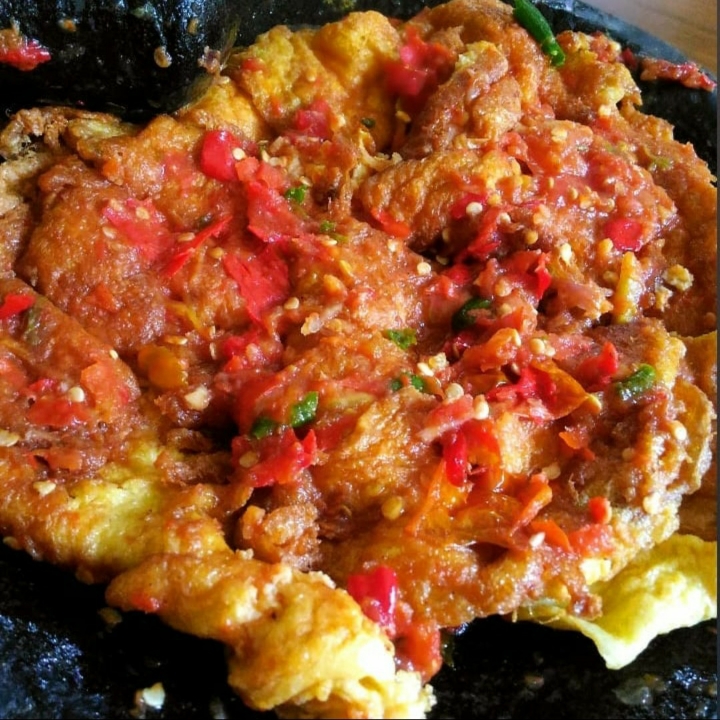 6. Akhirnya, geprek telur dan aduk sambal hingga merata.