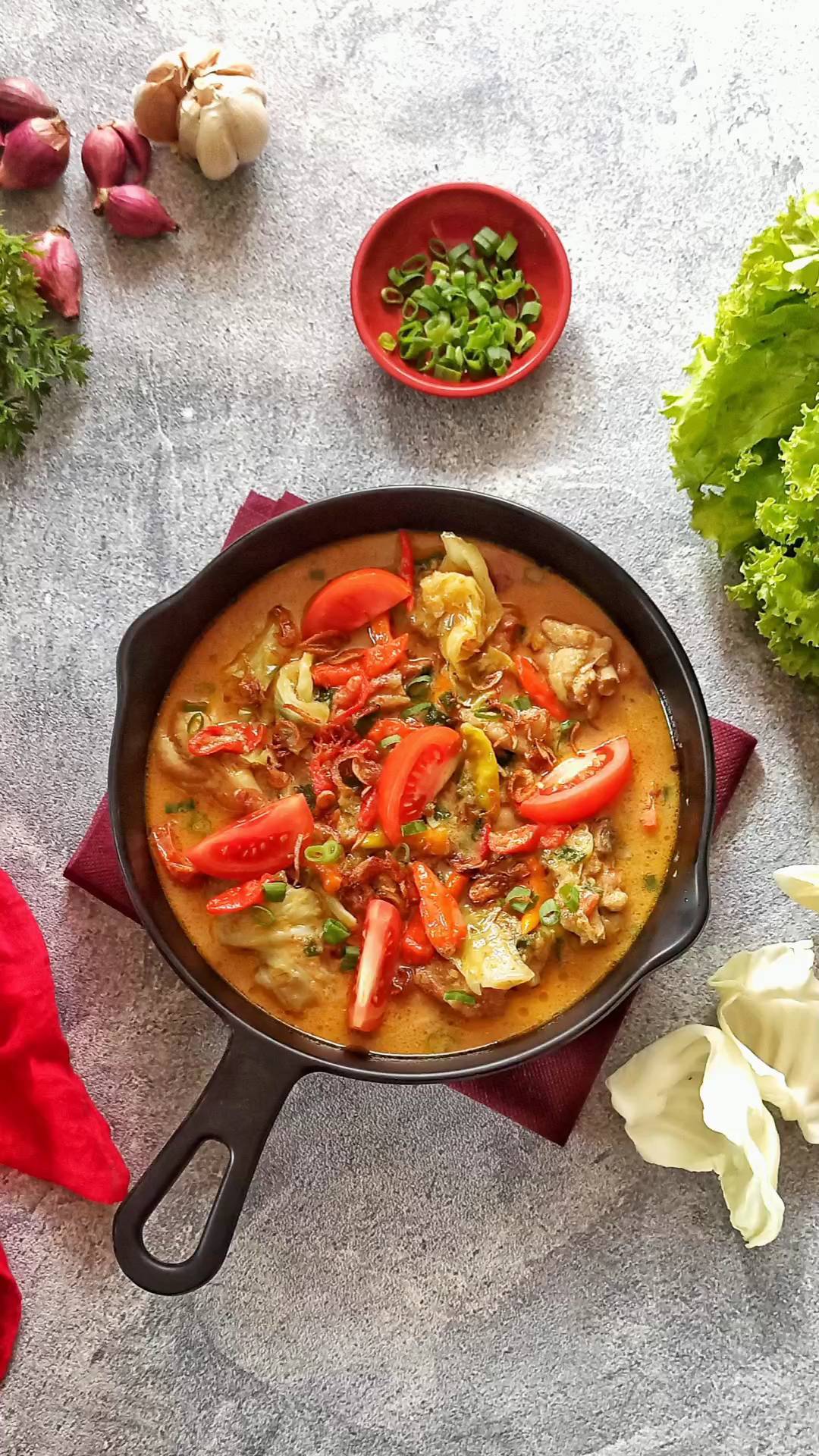 3. Tambahkan air, masak hingga air mendidih. Setelah itu, masukkan santan dan masak hingga mendidih. Tambahkan kubis dan tomat, lalu masak sebentar hingga tomat layu.